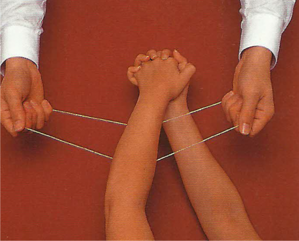 Um pedaço de corda é amarrado e passado em volta do braço do espectador. O mágico faz a corda atravessar o braço dele.